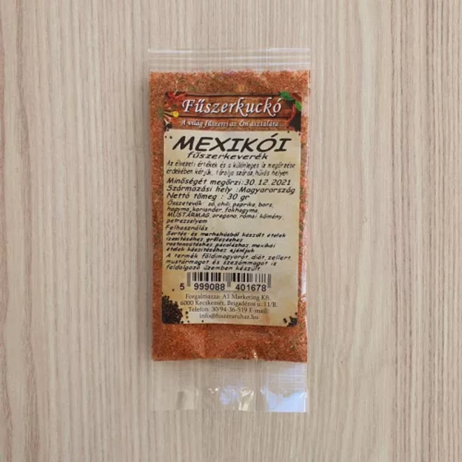 Összetétel: paprika, chili, hagyma, koriander, bors, fokhagyma, oregano, római kömény, petrezselyem, jódozott só, paprika kivonat, dextróz.