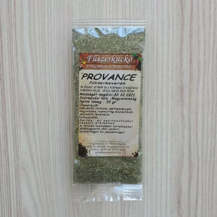 Összetétel: kakukkfű, petrezselyem, tárkony, majoranna, rozmaring, bazsalikom, szurokfű, levendula